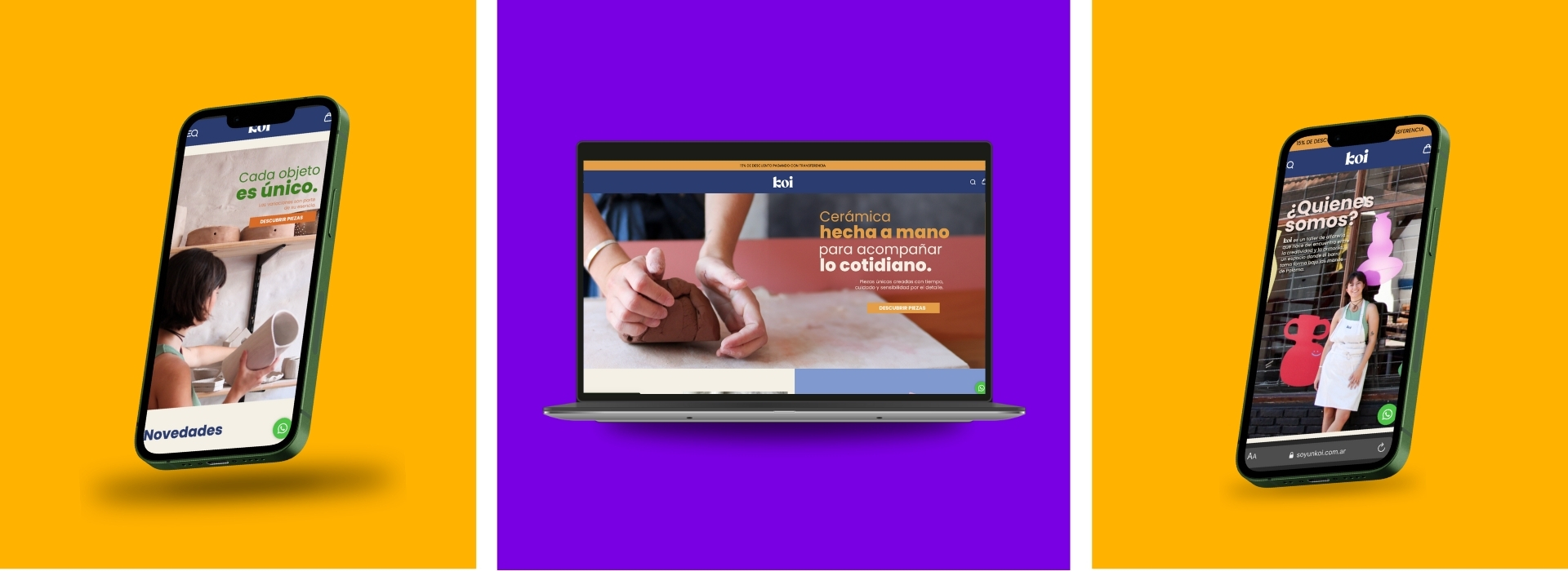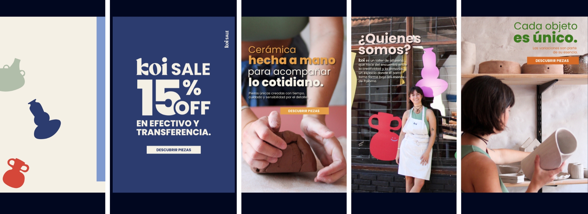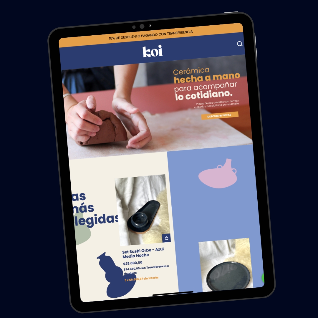 El primer paso fue comprender en profundidad la estética y el universo visual de Koi Cerámica. A partir de ese análisis, desarrollamos un branding digital adaptable a la web, que respetará su identidad artesanal y de diseño. En conjunto con el equipo de la marca, se definieron y produjeron los assets necesarios: banners, iconografía, paleta de colores y lineamientos visuales para lograr una experiencia coherente y diferencial.
